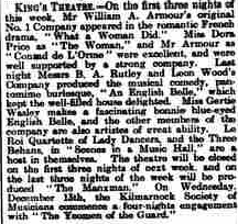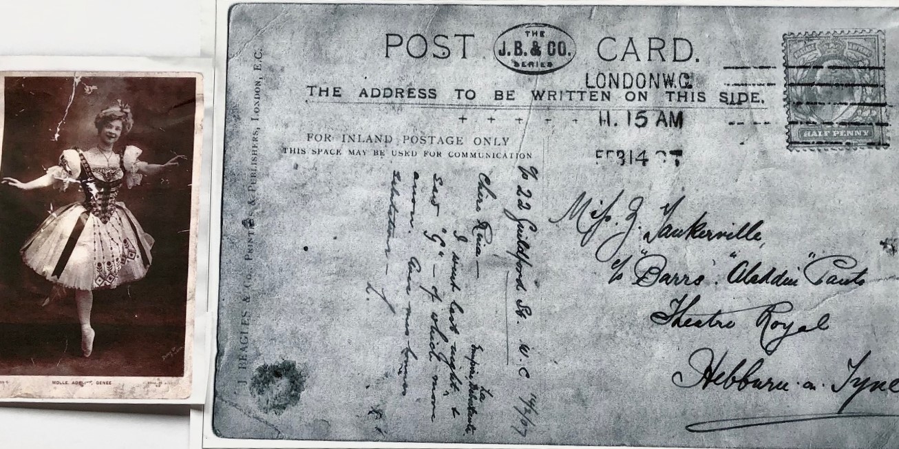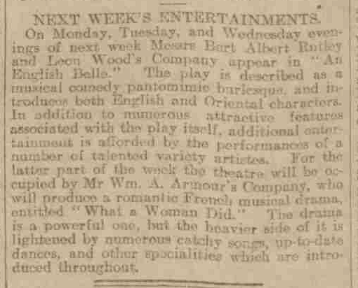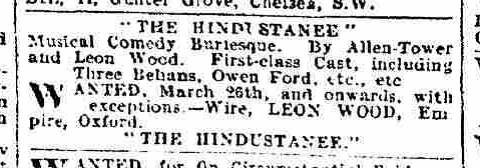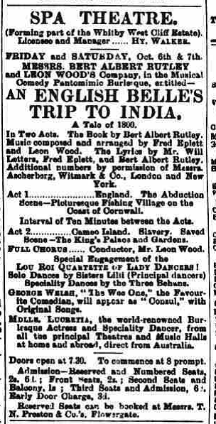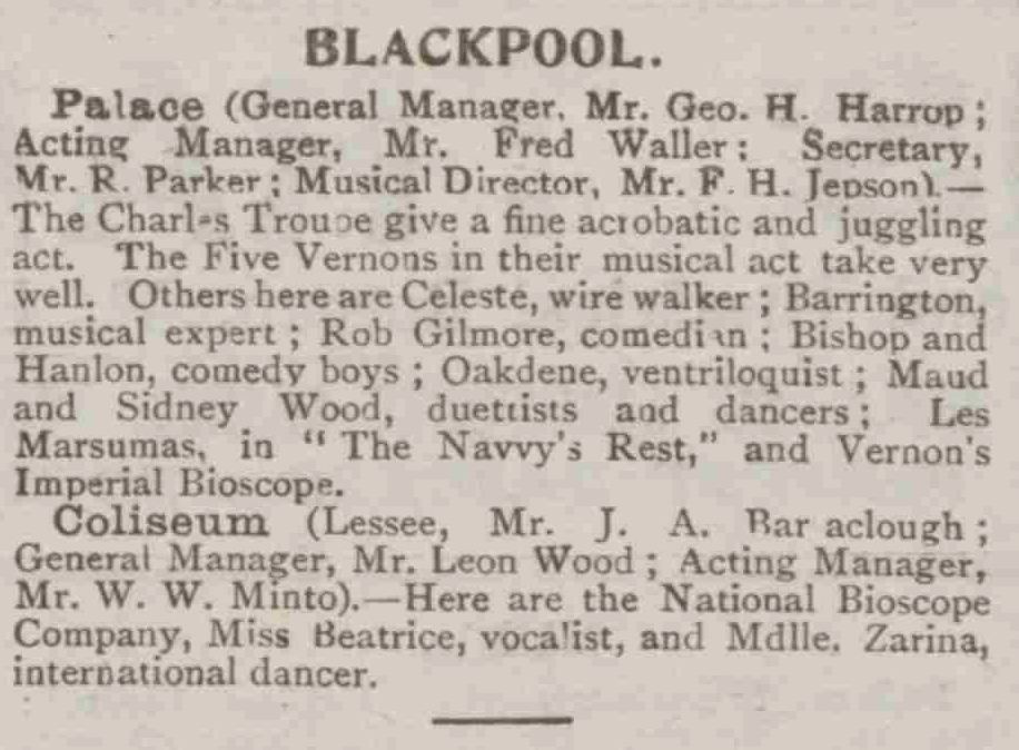 May 1905, Article in The ERA. This is the first time we see Bert Albert Rutley teamed up with Leon, in Sheffield. This is the one that we have the framed picture of. SHEFFIELD AMUSEMENTS NEXT WEEK. The booking at the Theatre Royal the musical comedy pantomimic burlesque, English Belle,” which comes to Sheffield for the first time. Bright music, smart dialogue, bristling fun, and graceful dancing are said the main features of the entertainment. The period of the play is the year 1800. The first act is set in a picturesque Cornwall fishing village, and the second in the Island of Cameo in the Pacific. The scenery and costumes form pleasing pictures. The company is that Messrs. Bert Albert Rutley and Leon Wood, and includes Mademoiselle Lucretia, recently returned from a visit to Australia; Miss Gertrude Wasley , Mr. George Welch, Mr. Fred Alberto, and Mr. Albert Rutley. (6) 22 June 1905, Article in The Stage. Leon’s and Albert Rutley’s company performing in the Prince of Wales theatre, Nuneaton. (7) 6 October 1905, Article in The Whitby Gazette. Leon and Albert Rutley’s company performing in the Spa theatre, Whitby, Yorkshire. (8) 2 November 1905, Article in the Falkirk Herald. One week later and the same company is in Falkirk, Scotland (9) 1 December 1905, Article in the Ardrossan & Saltcoats Herald Less than a month later the same performance at The Kings Theatre, Kilmarnock. (10) 08 March 1906, Advert in The Stage. Leon and A F Allen-Tower looking for venues to perform their musical burlesque comedy The Hindustanee from 26th March onwards. The return address is The Empire Oxford. (11) 5 May 1906, Article in The ERA. A review of the new production of The Hindustanee, 2 months later in Darwen, just south of Blackburn, Lancashire. (12) 25 May 1906, .Frank’s Notes. Leon Wood writes to Madam Tankerville (Zarina’s mother) from Banbridge, Northern Ireland. 07 June 1906, Article in The Brighton Gazette. Leon and Bert Rutley performing An English Belle at The Aquarium, Brighton. (13) 05 July 1906, Article in the Stage. Moving on two months later to Levenshulme, South Manchester, though this appears to be a further new costume variety show. (14) 26 July 1906, Article in The Stage. Looking for artistes of all types to perform at The Colosseum, Blackpool (15) 17 August 1906, Article in The Music Hall and Theatre Review. Leon is listed as Acting Manager at The Colosseum in Blackpool. This is the earliest reference to him in Blackpool (16) 02 November 1906, Article in The Music Hall and Theatre Review. 4 months later and Leon is Manager of the Colosseum Theatre, in Blackpool and Mdlle Zarina is a performer. (17) 16 November 1906, Article in The Music Hall and Theatre Review. Leon is named as General Manager of The Colosseum Theatre. It is a variety show including Mdlle Zarina, The New Zealand Animated Pictures Co along with vocals and a novel trapeze act. (18) 14 February 1907, Postcard from Leon to Zarina. Leon writes to Zarina from 22 Guildford St, London, W C. In it he says “met G more of anon” – Does G mean Gertrude, his first wife who he had not divorced? (19) 28 February 1907, Article in The Stage. Leon and Bert Rutley performing An English Belle at The Grand, Mansfield for 6 nights (20) 29 March 1907, Article in The Music Hall and Theatre Review. Leon listed as General Manager at The Colosseum Theatre, Blackpool (21) 11 April 1907, Franks Notes. Zarina writes to her mother from Enniskillen. Northern Ireland (22)