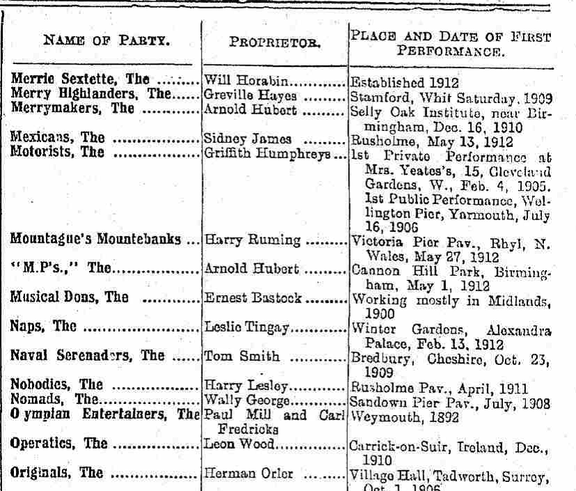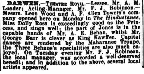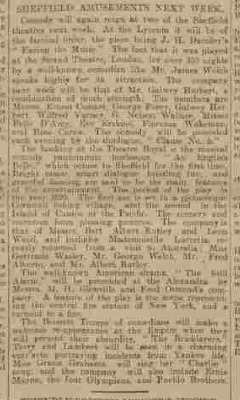 In the 1901 Census Leonard and Gertrude were living at 22 Aubrey St, Castleton, Rochdale, and Leonard was working as a Commercial Traveller (Chemicals). We do not know if he was still working as a Commercial Traveller, and perhaps his job took him to places that he later visited as a musician, or opened his eyes to a wider world than Rochdale, but the following articles from Newspaper archives, indicate he was travelling around the country performing in stage and music shows. The first of these is in Derby and appears to be over the period of December 1902 through to September 1905.