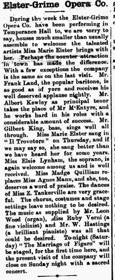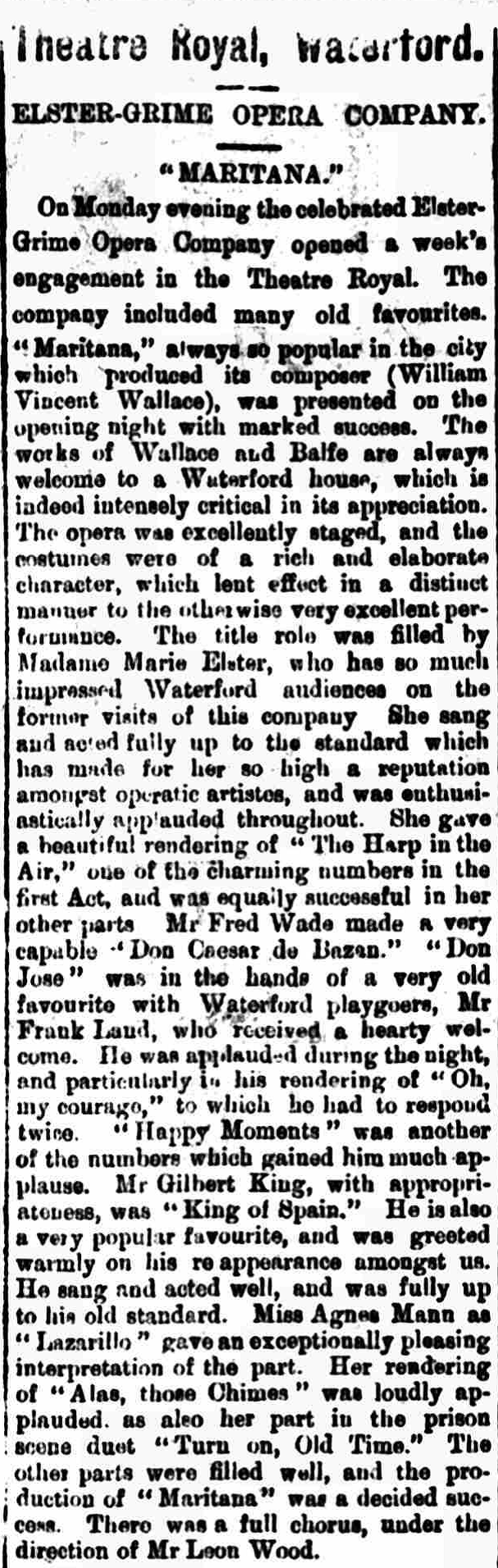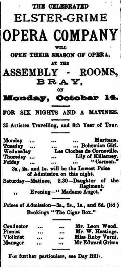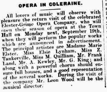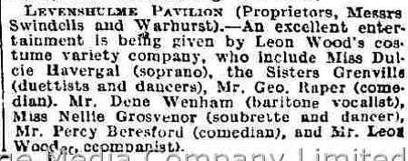 2 October 1907, The Wicklow Newsletter and Arklow Reporter. Leon is now in Ireland working for the Elster Grime Opera Company, in The Assembly Rooms, Bray. Leon was Conductor. (24) 21 March 1908, Article in The Longford Journal (Ireland). Leon still working in Ireland for Elster Grime. The report says ” And last but by no means least – (to use a hackneyed term) word for the Orchestra – small but very good – under the capable baton of Mr Leon Wood who presided at the organ”. (24) 23 March 1908, Advert in The ERA. Leon and Philip Clare have a “Wanted” advert for songs, scenes, sketches etc. (25) 24 April 1908, Postcard from Leon to Madam Tankerville. Postcard from c/o 23 East Bridge St, Enniskillen, N Ireland. Saying “R (Zarina) a little better and will write later. Very cold weather and snow here”. (26) 12 October 1907, The Wicklow Newsletter and Arklow Reporter. Leon is now in Ireland working for the Elster Grime Opera Company, in The Assembly Rooms, Bray. Leon was Conductor. (27) 21 March 1908, Article in The Longford Journal (Ireland). Leon still working in Ireland for Elster Grime. The report says ” And last but by no means least – (to use a hackneyed term) word for the Orchestra – small but very good – under the capable baton of Mr Leon Wood who presided at the organ”. (28) 23 March 1908, Advert in The ERA. Leon and Philip Clare have a “Wanted” advert for songs, scenes, sketches etc. (29) 27 April 1908, Postcard from Leon to Madam Tankerville. Postcard to Madam Tankerville from c/o Esme House, Glassborough St, Monaghan, “above our address this week. R. very much better” (30) 18 May 1908, Postcard from Leon to Madam Tankerville. Postcard to Madam Tankerville from c/o Mrs Murphy, Scotch St, Downpatrick, Northern Ireland. “All well. Had an outing to Warrenpoint and Rostrevor yesterday. 2 of Irelands beauty spots” (31) 25 May 1908, Postcard from Leon to Madam Tankerville. Postcard to Madam Tankerville from c/o 21 Scarva St, Banbridge, N Ireland. “Had a most pleasant day’s outing at Newcastle yesterday. G (Thomas Godfrey) was in fine form at the sea side. Rina is quite well again” (32) 10 September 1908, Article in The Waterford Mirror. A preview of a show with Elster Grime to be held at The Theatre Royal Waterford on Monday 14th September 1908. (33) 16 September 1908, Article in The Waterford Chronicle. A review of the Elster Grime performance of Maritana, with a full chorus under the direction of Leon Wood. (34) 13 March 1909, Article in The Longford Journal (Ireland). Leon performing as organist and conductor for Elster Grime Co (35) 15 October 1909, Leon Maurice was born. His and Zarina’s son Leon Maurice was born on October 15, 1909, in Athlone, Westmeath, Ireland. (36) 16 April 1910, Postcard from Leon to Madam Tankerville. Postcard to Madam Tankerville from c/o P O Lismore, Co Waterford, Ireland. (37) 17 September 1910, Article in The Coleraine Chronicle. Announcement of The Elster Grime season of Opera with Miss Z Tankerville as a principal artiste and Leon as the musical director. (38) 5 November 1910, Article in The Longford Journal (Ireland). A review of the Elster Grime performance in The Temperance Hall. Zarina’s dances were “very graceful” and Leon supplied the music on the organ. (39)