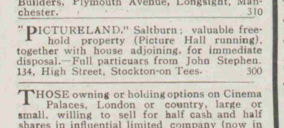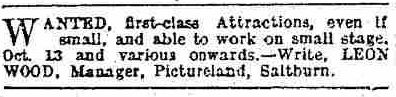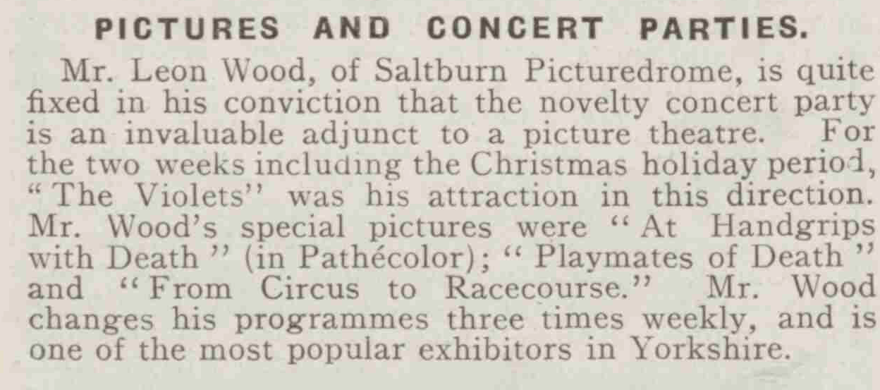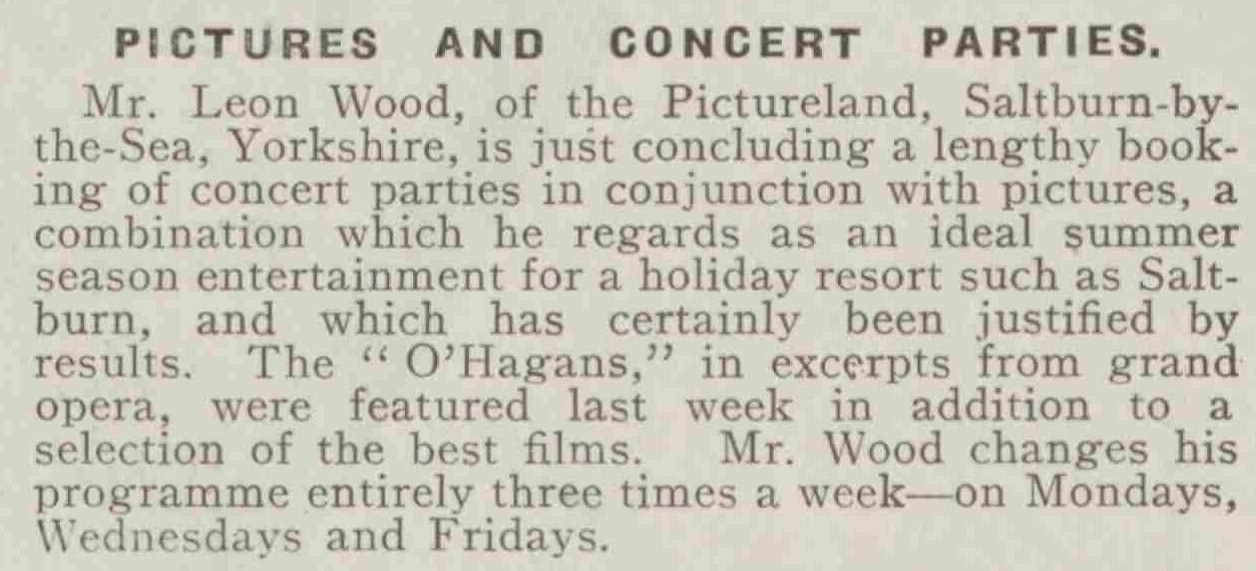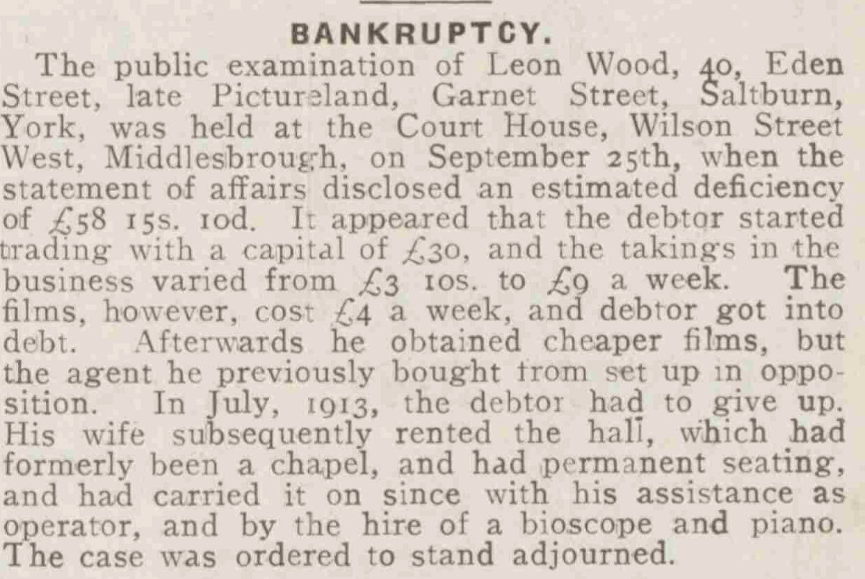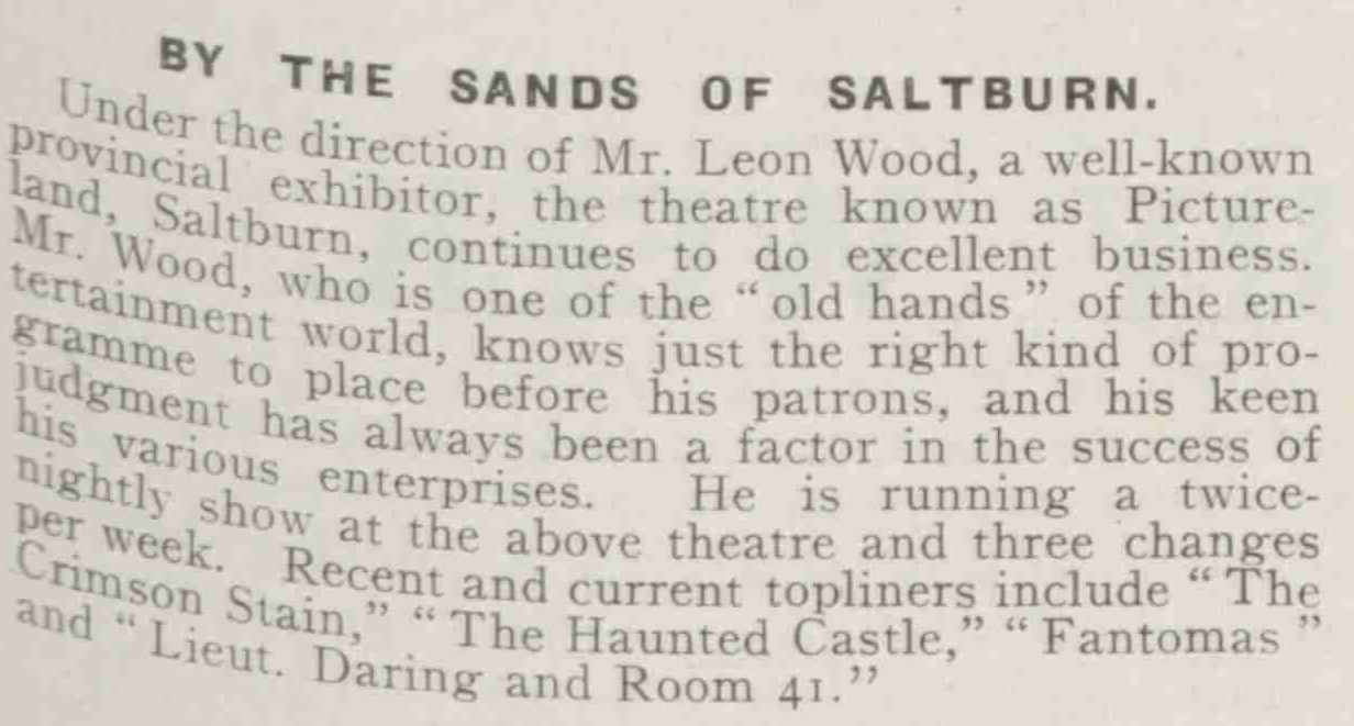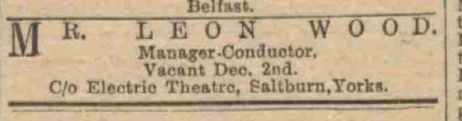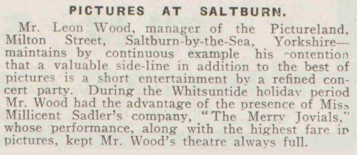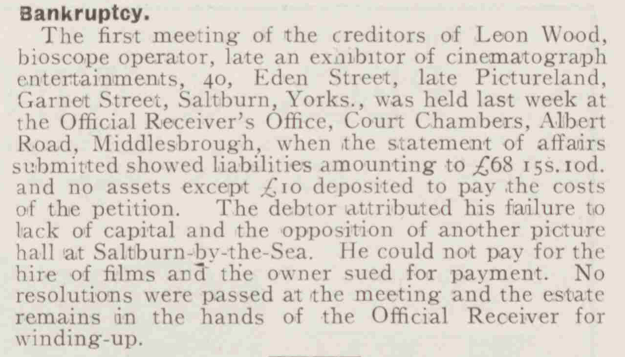 15 May 1911, Postcard from Leon to Madam Tankerville. Postcard to Madam Tankerville from 25 Ventnor Rd, Portland, “R. going along finely. Hopes to be up Wednesday. Write to her when you can.” This was a Monday and two days later their daughter was born. (40) 09 November 1911, Advert in The Stage. Leon advertising his services as a Manager- Conductor, c/o Electric Theatre, Saltburn, Yorkshire. (41) 11 January 1912, Advert in The Stage. Leon again advertising his services as Manager, Conductor. (42) 15 February 1912, Advert in the Bioscope. Leon has recently taken over the Pictureland in Saltburn and is looking for lists and catalogues from the Trade. (43) 25 April 1912, Letter published in The Bioscope. Leon complains about “Stock Companies” in a letter that is in response to an article in The Bioscope. (44) 02 May 1912, Letter in the Bioscope. A Mr J A Morgan refutes Leon’s letter in the previous issue of The Bioscope. (45) 11 July 1912, Advert in the Bioscope. PICTURELAND.” Saltburn; valuable freehold’ property (Picture Hall running), together with house adjoining, for immediate disposal.–Full particular’s from John Stephen. 134, High Street, Stockton-on Tees. (46) 15 August 1912, Advert in The Bioscope. Leon is advertising for Lists etc. as manager of the newly opened Tivoli Palace at Carlin How, North Yorkshire. (47) 23 January 1913, Article in The Bioscope. Leon endorses and advert for a Kamm Projector in The Bioscope. (48) 20 February 1913, Register of Companies in The Stage. Leon is registered as Proprietor of “The Operatics” in a listing in The Stage, first performing in Carrick on Suir, Ireland in December 1910 (49) 25 September 1913, Article in The Bioscope. A review of Leon’s productions at Pictureland, Saltburn. (50) 25 September 1913, Advert in The Stage. Leon as Manager of Pictureland is advertising for attractions to go on stage at Saltburn. (51) 8 January 1914, Advertorial in The Bioscope. Leon extols the benefits of his style of performances of novelty concert parties along with cinematic pictures that included At Handgrips with Death, Playmates of Death and From Circus to Racecourse. The programme changes 3 times per week and is one of the most popular in Yorkshire. (52) 12 March 1914, Advertorial in The Bioscope. Under the direction of Mr Leon Wood, a well-known provincial exhibitor, the theatre known as Pictureland, Saltburn, continues to do excellent business……..” (53) 06 May 1914, Notice in The North Eastern Daily Gazette. The Pierrots were very popular at seaside resorts and clearly Leon wanted part of the action. This was an acceptance by the local council of an offer from Leon. “It was decided to accept the offer of Mr Leon Wood, £4 for the use of the sands for Pierrots” (54) 18 June 1914, Article in The Bioscope. Claims that concert parties and films kept his theatre always full. (55) 05 September 1914, Article in The Yorkshire Post. Bankruptcy Receiving order. (56) 01 October 1914, Article in The Bioscope. Notification of Bankruptcy. The first meeting of the creditors of Leon Wood, of 40 Eden St, Saltburn was held a week earlier in Middlesbrough. Liabilities totalled £68 15s 10d. (Almost £6,000 at 2020 rates) (57)