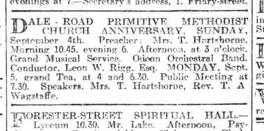 10 December 1902, News article in Derby Daily Telegraph, This article mentions Leon, arranger and conductor of the Odeon Orchestra as well as Mrs L W Rigg and as it is 1902 could well be Gertrude Holt Rigg (nee Sutcliffe). The event took place in Derby Theatre Gospel Hall. (1) 9 July 1903, Article in the Derby Daily Telegraph, Derby Wednesday Half-Holiday Early & Closing Association. (2) 08 January 1904, Article in the Derby Daily Telegraph, The Odeon Orchestra, conducted by Leon W Rigg (3) 09 March 1904, Article in the Derby Daily Telegraph, Leon conducting the Odeon Orchestral Band at the Primitive Methodist Chapel, Dale Rd, Derby. (4) 03 September 1904, News article in Derby Daily Telegraph, The Primitive Methodist Church, Dale Rd, Derby, It is again the Odeon Orchestra, with Leon as conductor. (5)