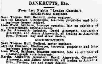 08 October 1914, Article in The Bioscope. A further article relating to the bankruptcy with more detail as to capital and income had resulted in the demise. It also appeared that Zarina subsequently rented the hall and Leon continued to operate the business. (58)