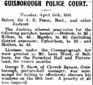 04 December 1914. Tivoli Theatre Carlin How burnt down. The Tivoli Theatre at Carlin How, Saltburn burns down. Apparently the reason for the fire was a mystery! (59) 5 September 1915, Leon and Zarina in Saltburn by the Sea. Living at 30 Pearl Street, Saltburn by the Sea (60) 28 April 1916, Article in The Whitby Gazette, Leon was granted a License under the Cinematograph Act for the Parochial Hall and Pictureland for a period of 12 months. (61)