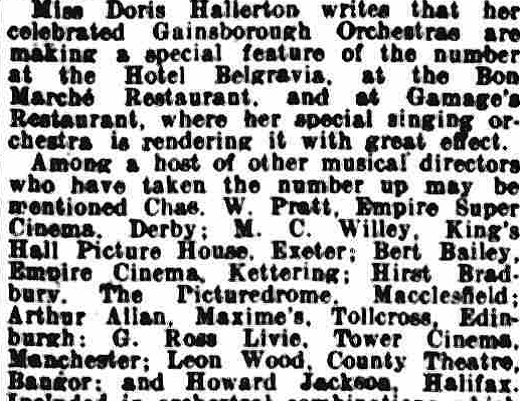 After his bankruptcy in 1914 it seems that Zarina took on the tenancy/leases etc. and Leon continued to run the shows, until in April 1916 Leon applied and was successfully granted a License under the Cinematograph Act for the Parochial Hall and Pictureland for a period of 12 months.