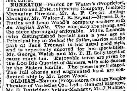 Leon continued to produce, conduct and perform in stage shows up and down the country. In July 1906, aged 32, Leon is shown to be Acting Manager at the Colosseum Theatre in Blackpool and by November of that same year he becomes Manager and Zarina is a performer at the same venue. During this period from November 1906 until at least March 1907 Leon was also doing a touring show of “An English Belle” along with Bert Rutley.