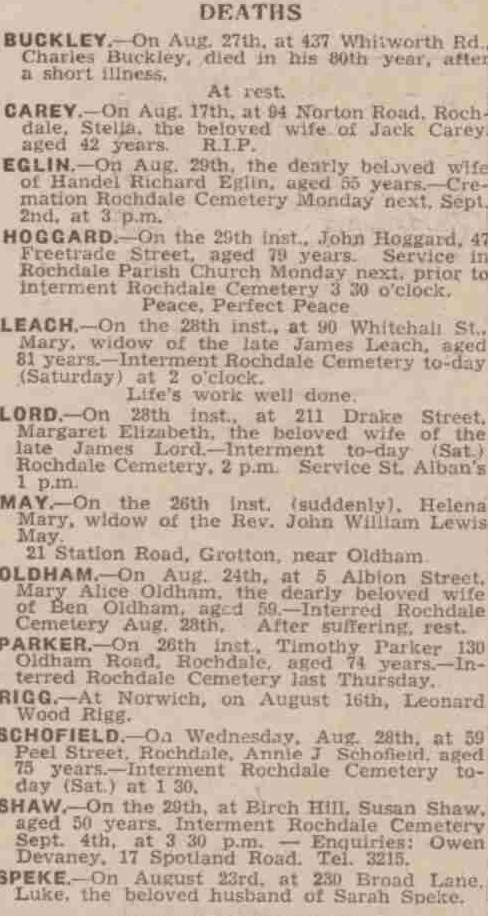 31 August 1940, Obituary in The Rochdale Observer. Rigg – At Norwich, on August 16th Leonard Wood Rigg (78) It is unclear who arranged this.